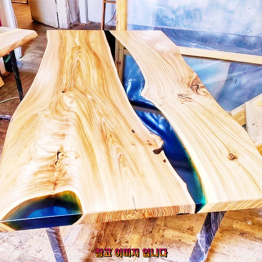 우드슬랩에 레진을 코팅하는 과정은 테이블의 표면을 매끄럽게 하고, 나무를 보호하는 역할을 합니다. 레진은 투명하거나 다양한 색상으로 염색할 수 있어, 디자인의 다양성을 제공합니다.